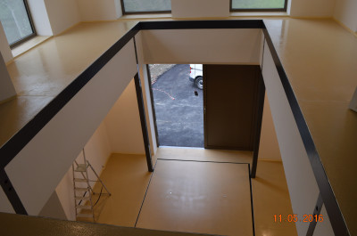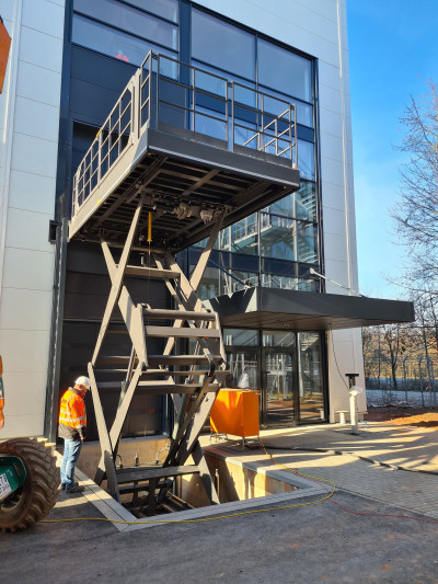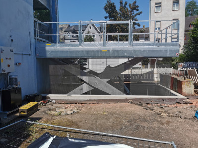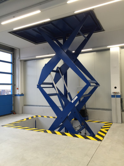 Hebebühne im Werkstattbereich zur Überbrückung einer Etage durch einen Deckendurchbruch hindurch.