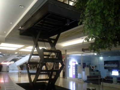 Im Untergeschoss eines Einkaufszentrums eingebaute Hebebühne, diese ermöglicht es z. B. Pkws zu Werbezwecken auf beide Ebenen zu transportieren.