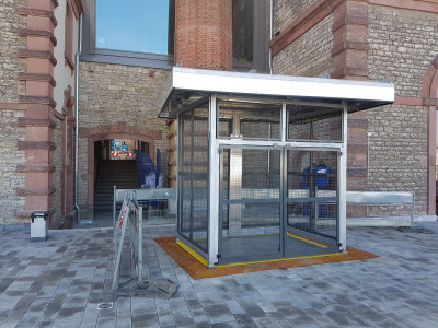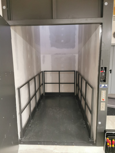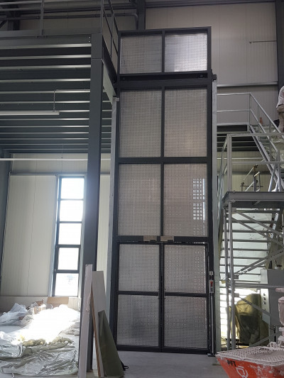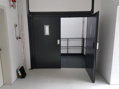 Hebebühne für Gütertransport in einem Schacht, mit Absturzsicherungen und Aufzug-Drehtür abgesichert.