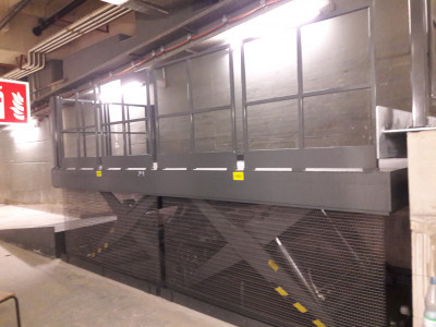 Hebebühne mit Auffahrschräge zum Überwinden eines Höhenversatzes im Untergeschoss eines Bahnhofes.